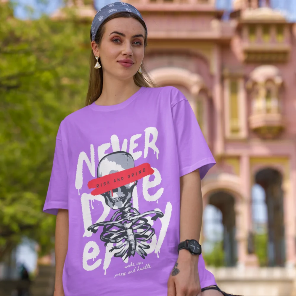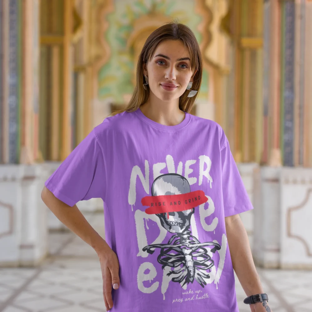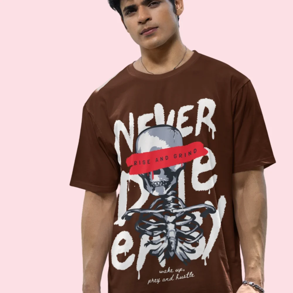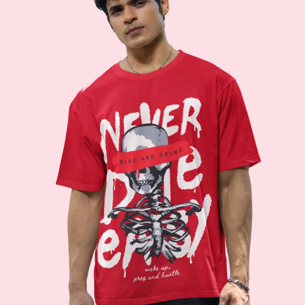 VibyVibes Men’s Oversized T-Shirt | 210 GSM Cotton | Red “Never Die Easy” Skeleton Graphic Tee | Streetwear for Men