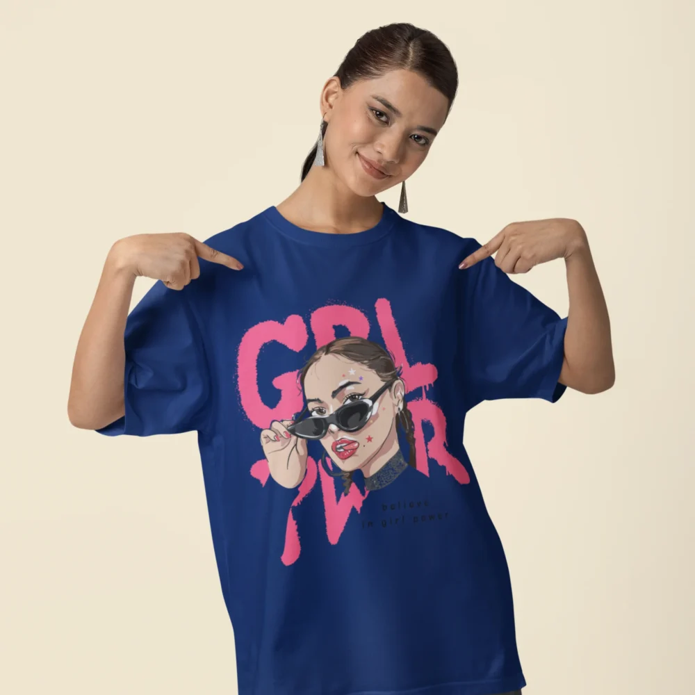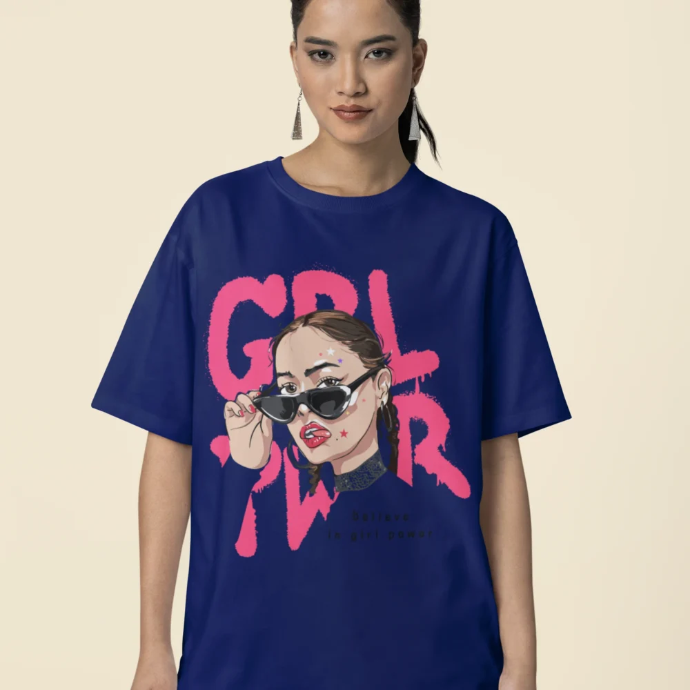 Oversized Graphic T-Shirt for Girls – GRL PWR Print | 100% Cotton Biowash | NavyBlue