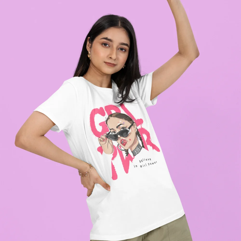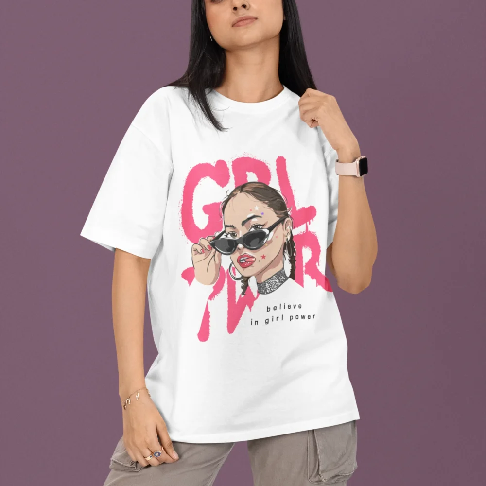 Trendy White GRL PWR T-Shirt – Oversized Drop Shoulder for Women