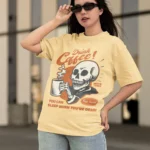 Unleash your caffeine-powered sass with this Retro Skull “Drink Coffee!” Oversized T-Shirt for Women. Crafted from premium 210 GSM bio-washed cotton, this drop shoulder tee blends comfort, edge, and attitude in a single bold look. Featuring a vintage-style skeleton graphic with a steaming coffee mug and the cheeky quote “You can sleep when you’re dead!”, this t-shirt is perfect for coffee lovers who live life at full throttle.